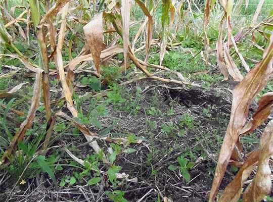 Majsforsøget med 10,5 planter pr. m² sået i gittermønster – her er meget mindre ukrudt. Foto: César Andres Marín