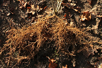 Almindelig Liguster er en velkendt hækplante. Her ses rodnettet af en kvalitetsplante i sorten ‘Liga’. Når man ser godt efter, bemærker man, at det trævlede rodnet ikke udspringer direkte fra rodhalsen, men først et stykke ude ad de tre-fire kraftige rødder. Det er et tegn på, at planten har været omplantet, hvad der giver den de bedste muligheder for at overleve efter udplantningen i hækken. Foto: Sten Porse