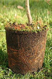 Det er en god ide altid at kontrollere rodklumpen ved at tage den ud af potten inden køb. Her er det nogle meget fine rødder. Rodfordelingen viser dog, at potten har været for våd i de nederste cm – muligvis fordi den har været vandet nedefra. Før plantning af sådan en plante, som er blevet vandet nedefra, bør man fjerne de øverste 2 cm af potteklumpen. Her svarer det ca. til at fjerne moslaget. På den måde får man fjernet eventuelle ophobninger af gødning, og man kan derefter dække med et 2 cm tykt lag af havejorden – uden at man begraver rodhalsen. Foto: Karna Maj