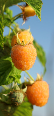 Efterårshindbærsorten ‘Fallgold’ er meget sød, men modner sent og skal plantes et sted med masser af sol i efterårsmånederne. Foto: Karna Maj