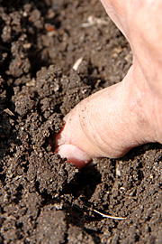 Hvis jorden er god løs, er går det nemt. Løsn evt. med en hakke eller smal kultivator inden lægning. Foto: Karna Maj
