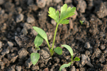 Kimplanter af persille. Især den glatbladede persille og persillerod kan det være svært at se forskel på selv ved første hold blade. Det er derfor vigtigt at sætte planteskilte ved rækkerne eller skrive op på papir. Foto: Karna Maj