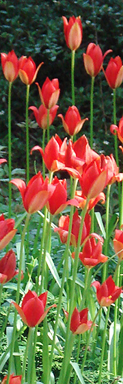 Man kan købe de oprindelige arter, men også et væld af hybrider af især de storblomstrede, lave slags som Tulipa kaufmanniana og Greigii. De er ret overvældende, på grænsen til det vulgære, men nogen gange må en forårshave godt være vulgær i al sin iver efter farvepragt. Og man kan være sikker på, at de gudskelov bliver lidt mindre efterhånden derude, når de skal klare sig selv.