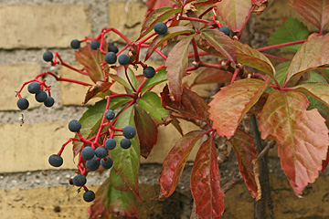 Almindelig vildvin, Parthenocissus inserta, med de smukke blålige bær. Kongens Have. Foto: Karna Maj
