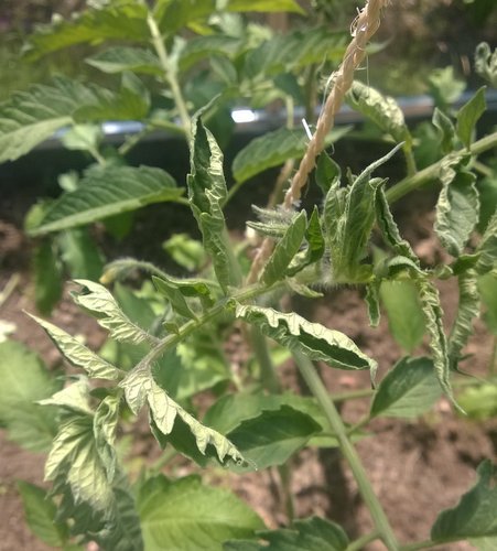 Jeg har tit set krøllede blade på mine tomater, og det ser ikke ud til at påvirke mængden af tomater.