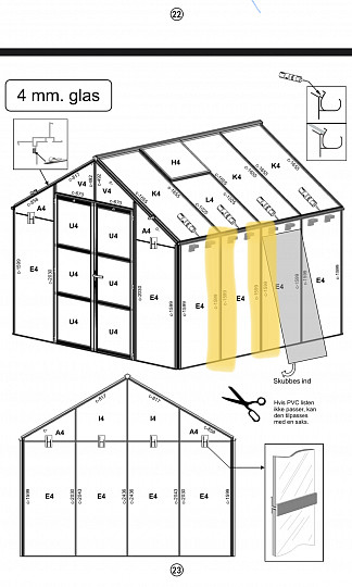 Inden du begynder at montere glas så mål ud at alle glas kan være der. Vores skelet var for lille på fronten. Dvs det var trukket for meget sammen i samlingen ved den trekant over dørene. Hvilket kan være svært at se i vejledningen, man kan kun se den ene side. Så vi måtte hejse i taget efter vi havde sat glas i. Heldigvis holdt det. Og nu passer det. Ja vi har sat gummilister under alle glas. Og der skal to bøjler på hvert sidestykke. Husk at fuge forneden inden du sætter glas i. Det gjorde vi ikke fordi det var møjvejr i efteråret og vi skulle bare være færdige. Så nu skal vi bøvle lidt med det. Og man skal være min to til montering af glasset. Men er glad nok for huset. Havde bøvl med dørene. Men de har sundet sig i løbet af vinteren, tænker huset har ‘sat sig’ og lukker nu. Så alt i alt: en oplevelse at lave drivhus. Men vores ægteskab overlevede 🤣