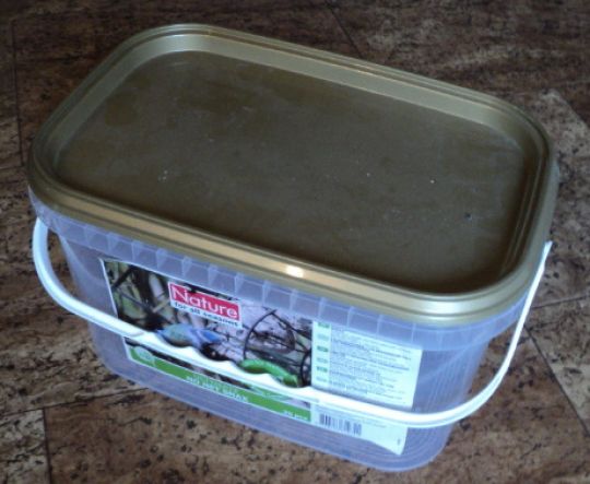 Jeg havde egentlig tænkt mig snart at bygge en ny foderkasse i træ, men jeg tror måske, at der kan gå barnlig sport i at se, hvad nogle få hurtige reparationer kan gøre for papkassens levetid.