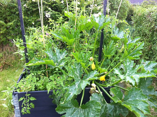 Min squash plante står i mit højbed sammen med tomater, porrer og ærteblomster, og alt gror fantastisk.