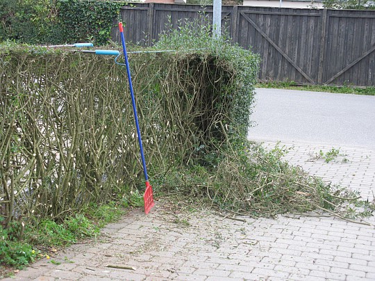 Vores interesser er jo meget forskellige. På det første billede har naboen allerede 2 år før fjernet ca. 1 meters bredde af hækken. Nu var det så min tur - også fordi vores hæk er klippet hvert år - i modsætning til naboens hæk. Der er jo grænser for hvor tæt jeg kunne gå på min side, hvis ikke det hele skulle vælte over til naboen. På billedet synes jeg at man kan se lidt af hvor bred hækken var på vores side og hvor langt jeg klippede ind. Faktisk så tæt ind til stammen som muligt. I år er der rigtig mange bær i hækken. Mon den gør oprør?