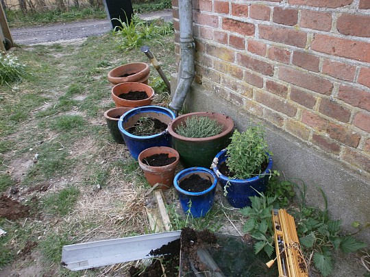 I den største af de blå- er der en rødbroget mynte. Den skulle gro ret ustyrligt. 2 stiklinger er plantet ud i haven.