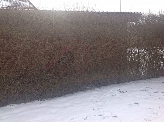 Jeg har en gammel ligusterhæk, der er noget tynd i det. Hækken står i skel mod syd i skyggen af naboens garage. Jeg er meget glad for hækken og vil gerne hjælpe den til at blive kraftig og robust. Jeg er klar på at klippe den ned til 5 cm, men jeg vil først høre jer om der overhovedet er håb for en frodig ligusterhæk i skyggen nord for garagen, som det ses på billedet?