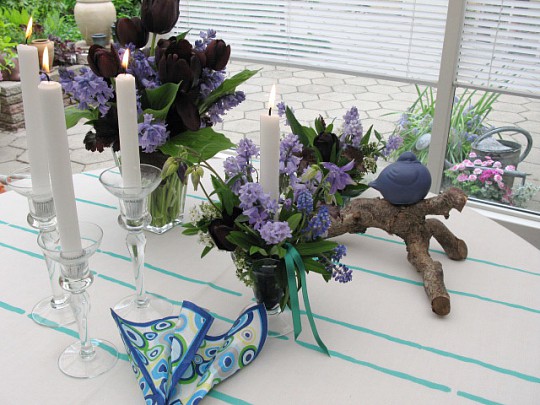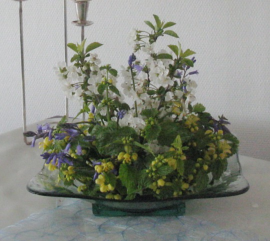 Jeg må desværre sige at det ikke lykkedes at få de store scilla i blomst til den 10. maj. Dog kunne jeg plukke en del i et stykke have, som ellers er "skov". Her er blomsterne ikke så store, men hovedsagen var at de var blå til min borddækning, hvor det hele helst skulle passe lidt sammen. Det endte med at jeg var ude at botanisere i nabolaget, hvor jeg vidste at der på en kommunal grund voksede hundreder af gule døvnælder (Guldnælde ?). Så jeg fik de gratis blomster jeg gerne ville bruge: gule nælder, scilla og kirsebærgrene. Nælderne havde også en masse limefarvede blomsterløse skud. Det blev helt fint alligevel!
