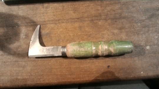 Er den kun slebet på den ene side, mener jeg at den bliver brugt hos en bådebygger/bødker som en forstørret kniv. Som fugerenser behøver den ikke at være skarp. Henry G.