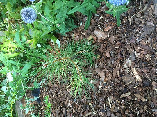 Og så et af baby-træet, formentlig på 2. vækstsæson. Jeg passede den i en potte sidste år og plantede ud i efteråret. Der er ikke umiddelbart andre fyrretræer i nærheden som kunne være ophav.