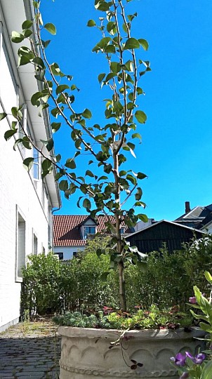 Vi gav min far dette pæretræ (clara friis) til hans 90 års fødselsdag. Han er flyttet fra en stor en have til denne meget lille gårdhave og blev rigtig glad for at dette lille træ som han håber vil komme til at blomstre til foråret. Efterfølgende har jeg fundet ud af det med at man med pæretræer skal have mere end et for bestøvning, men blomster kommer der vel alligevel :-)