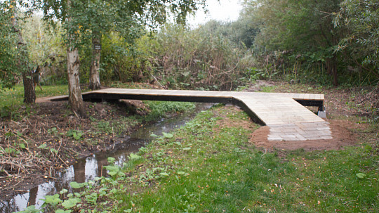 På billedet ses den nye bro over bækken ved indgangen til vores daværende have. Dengang blev der på broens midte sat hønsenet på med kramper. Gangbro var af trykimprægneret fyr. Brædder blev efter tid i det skyggefulde og fugtige miljø med nedfaldne blade fra bl.a. birk og pil ret slimet.