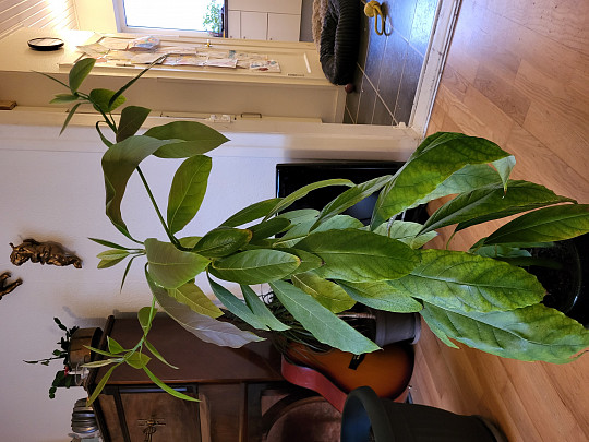 Om sommeren står den på terassen, og om vinteren er den inde. Den taber nogle af bladene når den kommer ind, men beholder stadig mange, og der kommer flere.