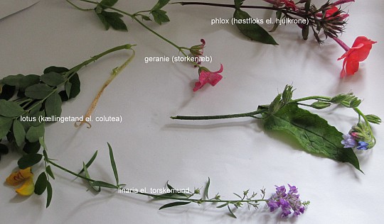 Den øverste er en phlox (høstfloks), hvilken kan jeg ikke se. Den øverste/midten ligner mest en geranie (storkenæb), igen hvilken er svært at se på billedet.
