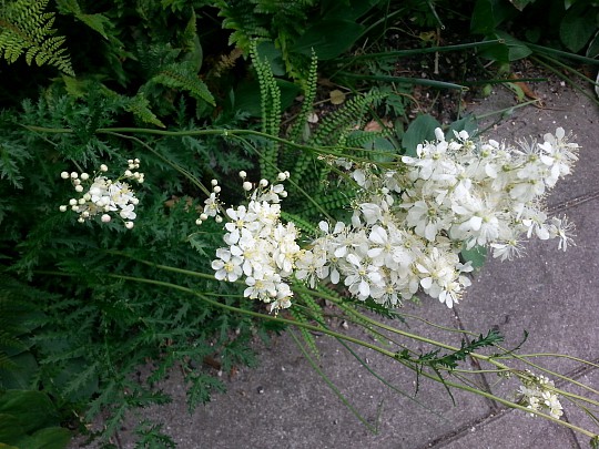 Kan nogen fortælle mig hvilken staude jeg har her? Løvet minder om røllike, blomsten gør ikke. Den står for skygget og strækker blomsterne efter lyset. Så den skal flyttes. Men hvad er det?