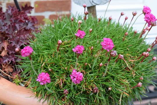 Alunrod (Heuchera?) er virkelig fine røde planter som jeg har ret mange af. Du kan se dem lige bag ved krukkerne med de dobbelte Petunia. Jeg har også nogle limegrønne Heuchera. Det er fantastiske planter, som mange steder er bundplanter under rododendron. Eneste ulempe ved dem er at de vokser sig højere. De seneste år har jeg bare klippet dem ned - eller retter sagt brækket stænglerne af.