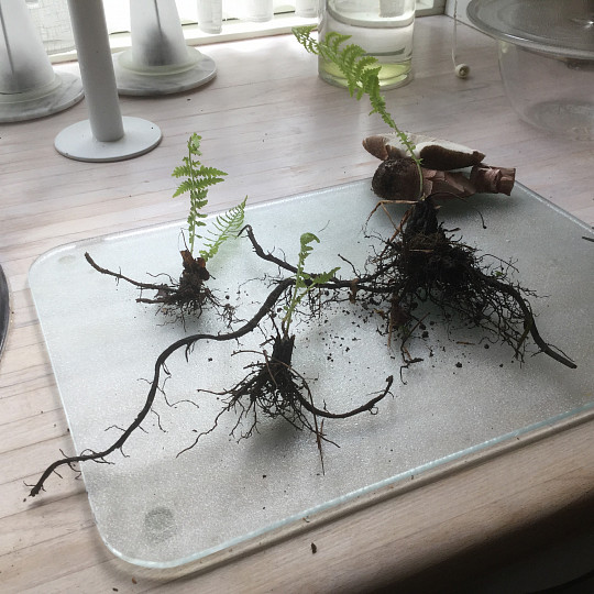 Nu er der skudt nye små bregner op rundt omkring og som lovet iler jeg med at vise at mine kurve/strudsevingebregner får underjordiske udløbere, som danner nye planter, næsten som skvalderkål.