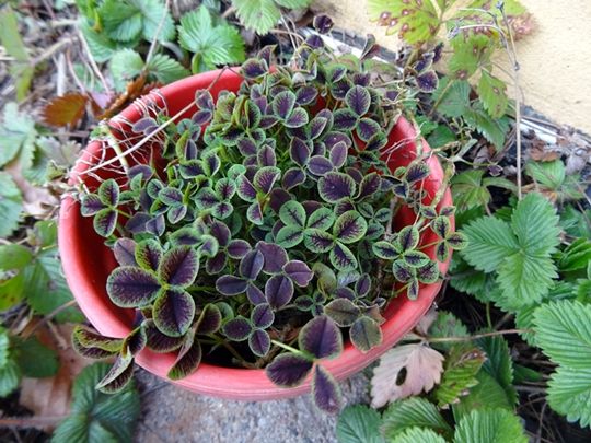 Til start stod den i en balje vand, men jeg læte, at den ikke tålte frost og væde, så jeg satte den tæt op ad huset. Nu ville jeg så se, om den kunne plantes ud. Og så er skiltet væk ... og det er jo ikke en lykkekløver, som jeg huskede.