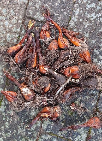 Jeg syntes ikke at dine løg ser sunde ud, dem på dette billede her. Disse ligner i øvrigt også påskeliljer og ikke tulipaner. Sæt dem et afsides sted i haven og gør som tidligere beskrevet, men er de syge så kommer de sikkert ikke, men vil ligge og rådne i jorden igennem vinteren.
