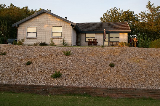 Vores hus ligger ret højt på grunden. Mod vest er der en skråning ned mod byen - det er ud mod en vej, så der er ingen naboer at tage hensyn til. Der er plantet diverse buske og lagt flis ud. Vi kunne godt tænke os nogle træer, men omvendt vil vi heller ikke have ødelagt udsigten.