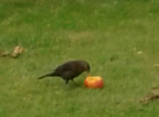 Mens jeg venter på bionettet har jeg sat ind med afværgefodring. Sådan ser et æble ud når det har ligget på min plæne fra kl 20 til 10.30 næste formiddag.