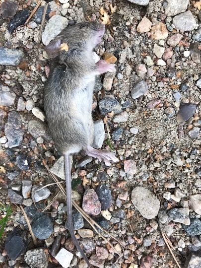 En nærmere undersøgelse af halens kan være med til at afklare om det er mus eller rotte. Rotter har stive, korte hår på halen og mus har små skæl som dækker halen (det er vanskeligt / umuligt at se på billedet). Med en lup over den døde mus's hale vil det være muligt at skelne meget entydigt.