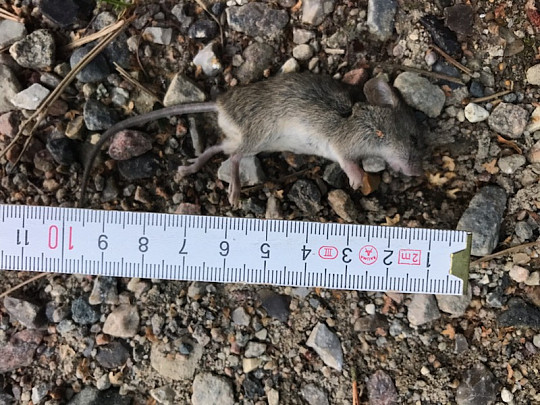 Mit umiddelbare gæt er en rotteunge, når du ikke har mål på den. Men det kan også være en stor halsbåndmus - farven er dog i såfald afvigende. :(