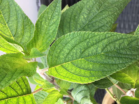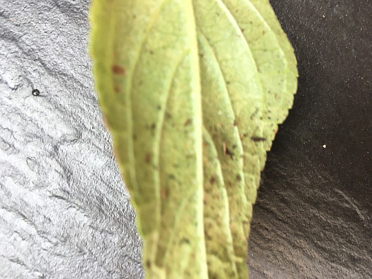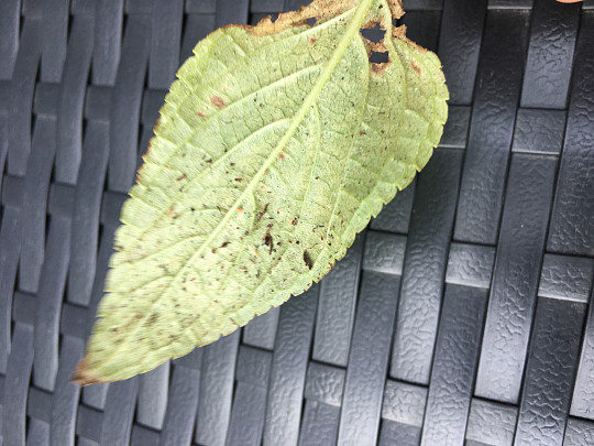 Der er lidt spind på undersiden af få bladene og masse små sorte pletter man kan se.