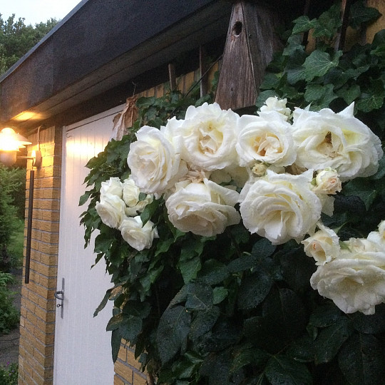 Stor var min overraskelse da den fik de flotteste store blanke blade på nye meterlange stilke. Jeg var spændt på, hvornår melduggen ville vise sig, men rosen forblev sund og rask! Den er ikke remonterende og dens navn husker jeg ikke. Den er over 35 år gammel og er plantet ved garagens væg. Desværre er det en kort fornøjelse, når så mange blomster springer ud på samme tid.