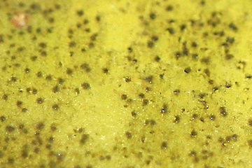 Den grønne belægning er svampenes mycelium. Den er uden på æblet og kan skrubbes af. Foto: Karna Maj