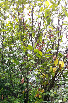 Delvis visne og gule blade på laurbærkirsebær. Foto: Kirsti Kærn