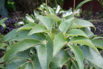 Jeg har sidste sommer købt en plante uden navneskilt på i en hollansk planteskole og var overbevist om, at det var en julerose. I stedet for at skyde fra bunden, fremkommer bladene, som er halvstive med stikkende spidser, på hovedstilken, og den vokser i løbet af sommeren – dog uden ansats til blomster.