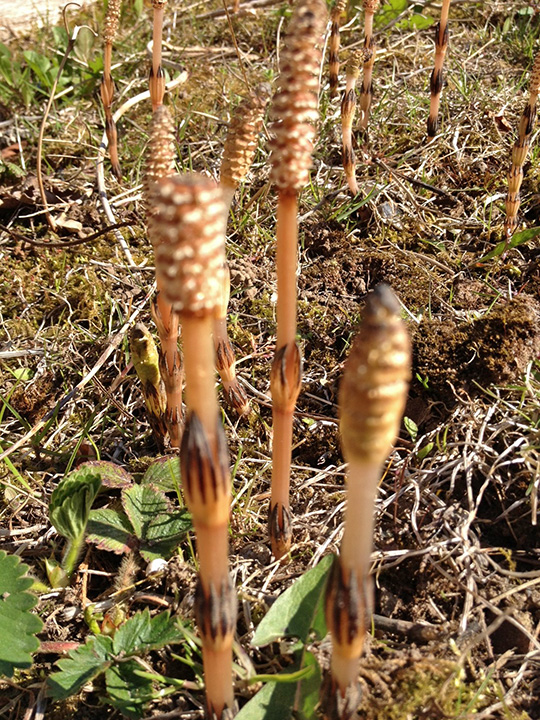 Planten er ikke en svamp – det er kun lige, når den kommer frem, at den kan minde om en svamp. Om kort tid ligner den et lille lysegrønt minijuletræ. Den er ikke giftig. Planten er agerpadderok, Equisetum arvense. Det er de gode nyheder.