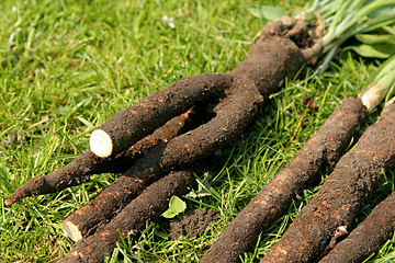 Jeg har lerjord, men jeg har fundet en brugbar metode. Med en greb løsner jeg jorden hele vejen rundt, men uden at brække greben så langt bagover, at roden knækker. Når jorden er løsnet, fjerner jeg jorden inde omkring roden 15–20 cm ned, så jeg kan komme ned og få godt fat med hele hånden omkring roden. Den kan så trækkes op med et meget langt og sejt træk. Når man er lige ved at opgive, så løsner den sig pludselig, og op kommer den og ofte med en intakt rodspids – men kun hvis det er en lige rod. Hvis den har forgreninger, så kommer den enten slet ikke, og der må løsnes mere jord, eller den kommer op med nogle knækkede siderødder.